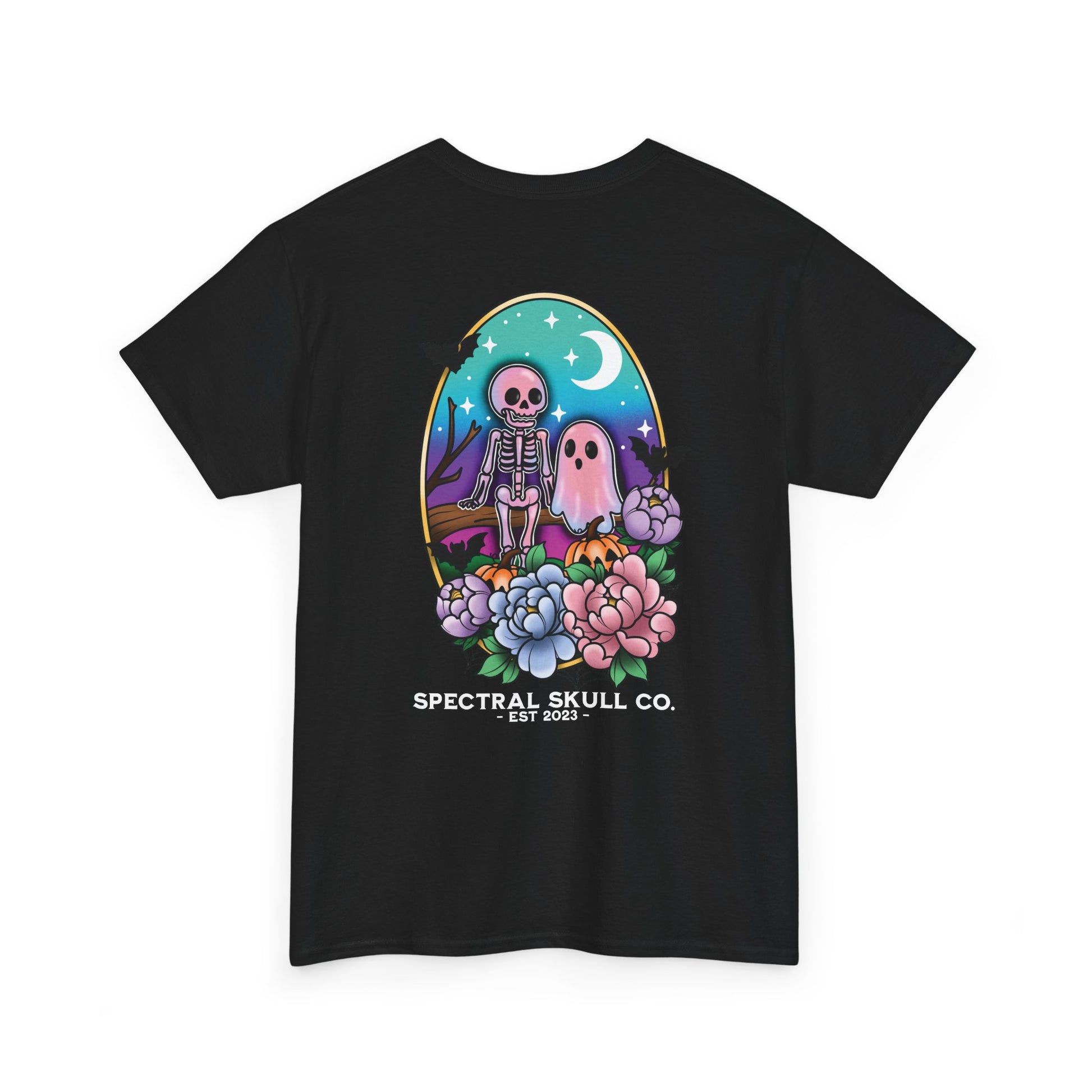 This cute Tee features a design of a ghost and skeleton sitting on a log surrounded by bats, spiders, and flowers. It gives off a spooky yet adorable vibe, perfect for Halloween enthusiasts and those who love the paranormal. It can be a fun addition to a casual outfit and a great conversation starter during the Halloween season.